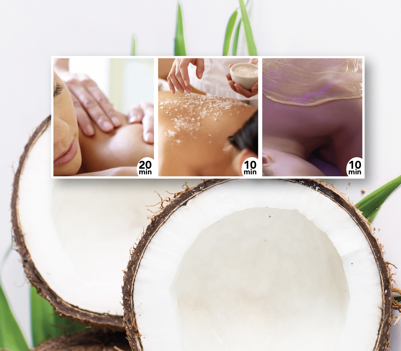 Ce rituel commence par un gommage gourmand au sucre et à la pulpe de coco, qui élimine délicatement les cellules mortes, lisse la peau et prolonge votre bronzage. Il se poursuit par un massage à l’huile vanillée adoucissante, qui lutte contre le dessèchement de la peau. Pour terminer, un enveloppement chaud au monoï est appliqué sur l’ensemble du corps afin de nourrir intensément la peau. Durée : 45 min + douche